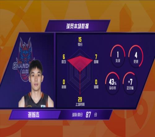谢智杰本场首发登场,开局阶段山东高速迟迟未能打开得分账户,前3分钟只得2分,这时谢智杰开启进攻模式,他先接队友助攻三分远投命中,随后自己借助挡拆罚球线跳投得手,帮助球队迅速追近比分。进攻端,这位二年级新秀展现出了自己进攻的多样手段,除了挡拆后的处理球,谢智杰在转换进攻方面同样让人印象深刻,他多次快下得分或助攻队友。全场比赛,谢智杰个人生涯第3高的15分,7篮板和6次助攻同为生涯第2高。