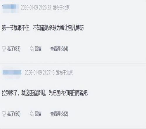 小曾在攻防两端的糟糕表现成了球迷们热议的焦点,有球迷形容小曾本场比赛的表现:没有任何一点防守,没有对抗,没有力量,没有横移,没有阅还有球迷直接嘲讽:拉到家了,就这还追梦呢,先把国内打明白再说吧。