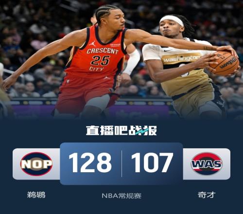 开场后鹈鹕上来先中两记三分开局,奇才多点开花咬住比分,锡安连续强攻内线得手帮助鹈鹕建立领先,锡安下场休息后奇才连续补篮缩小分差。第二节刚上来两队又是僵持局面,还是依靠墨菲和锡安的发挥鹈鹕又将分差拉大,上半场鹈鹕领先10分。易边再战,锡安和墨菲延续火热状态又是轮番砍分,鹈鹕将场上分差拉大到20分,此后奇才稳住阵脚通过反击追分。第四节奇才内外开花追到只差10分,不过锡安回来后依旧打得十分强势,他多次制造杀伤帮助鹈鹕稳住局面,比分再次被拉开,比赛失去悬念,最终鹈鹕128-107轻取奇才结束9连败,奇才遭遇2连败。