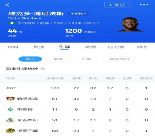 去年夏窗,AC米兰曾一度接近租借博尼法斯,但最终球员体检未能通过交易取消,随即博尼法斯被勒沃库森外租至不莱梅,本赛季出战11场比赛,贡献2次助攻,德转身价仅剩1200万欧。