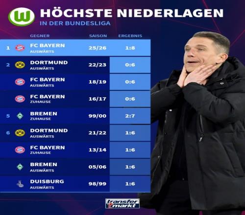 狼堡德甲最大比分输球纪录榜: