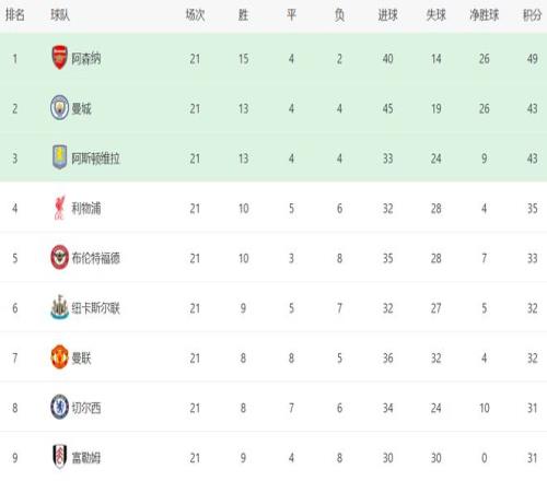 阿森纳虽然只拿到一场平局,但依然占据了榜首位置。阿森纳21轮狂揽49分排名第1,身后的曼城和阿斯顿维拉都是43分。也就是说,阿森纳有6分的优势,依然是夺冠最大热门。而利物浦则落后有点多了,只拿到35分,排名第4。事实上,利物浦第4的位置并不稳,与身后的球队差距很小。