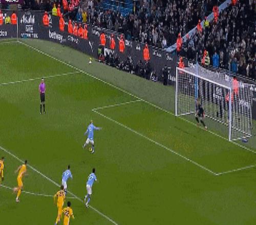 第80分钟,曼城错失绝杀良机。布莱顿禁区失误被断,谢尔基横传哈兰德射门被没收。